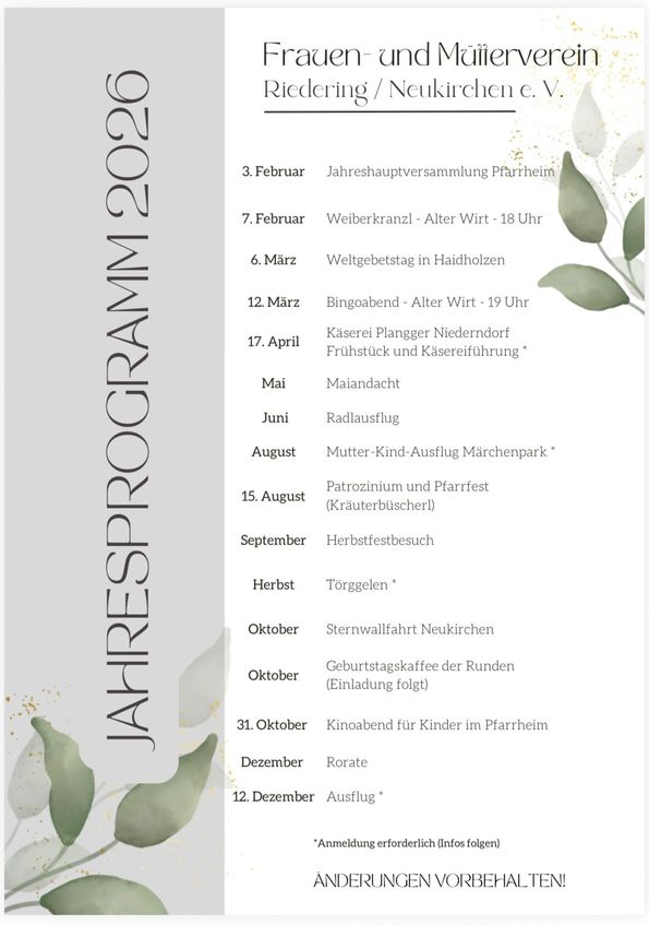 Frauen- und Mütterverein Riedering/Neukirchen e.V.Termine/ Jahresprogramm ![]() Flower / 6524872 - Kati Molin [fotolia.com] Aktuelle Informationen und Änderungen erhaltet ihr immer in der Tageszeitung (OVB), in der Whatsapp Community und auf Instagram Kostenlose Webseite von Beepworld Verantwortlich für den Inhalt dieser Seite ist ausschließlich der Autor dieser Homepage, kontaktierbar über dieses Formular! |